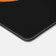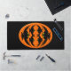 Ce somptueux tapis de bureau présente un ovale orange avec six corbeaux. Chaque corbeau a des yeux jaunes avec des élèves noirs et des ailes étirées. Les corbeaux volent vers l'autre formant une forme ovale. L'arrière - plan est noir.