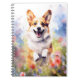 Colourful watercolor artwork of a Corgi sitting in a field of spring flowers.