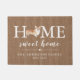 Personalized home sweet home door mat featuring a Corgi dog, with your family name & year established, set on a brown burlap look background
