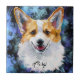 Anyone who has lost their heart to an adorable Corgi Dog will love this tile! It features an artist rendering of a Pembroke Welsh Corgi looking out from an abstract painted background. The predominant colours in the background are black, blue, lavender, with a touch of aqua. The warm and cool colours in the dog portrait stand out beautifully from the background. At the bottom is custom text in black script that says "Corgi". You may customize the text, or even remove it if you prefer.