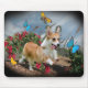 Playful Welsh Corgi running with colourful butterflies against a background of flowers will make an attractive design for the dog lover of this herding dog breed.