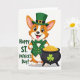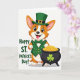This card features a cheerful corgi with orange-and-white fur dressed in emerald green, wearing a tall leprechaun hat with a gold buckle, a green polka-dot vest, and a neat bow tie 💚. The dog’s wide dark eyes and open smile, with a pink tongue peeking out, make it feel like it’s greeting a close friend with easy affection. Beside the corgi sits a black pot overflowing with shiny gold coins, and a bright green shamrock emblem decorates the pot’s front ☘️. On the left side, the phrase “Happy St. Patrick’s Day!” appears in large emerald green letters, standing out clearly against the background. The setting is a plain white field that keeps the focus on the greens, warm orange fur, and the gold coin shine. Simple shapes and flat color give the scene a tidy, modern look without extra clutter. The hat’s buckle is a small rectangle of gold, and the coins are stacked and scattered in rounded piles along the pot’s rim.