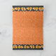 Orange swrils pattern on the background, illustrated with cute corn candies on the bottom. A sweet little girl disguised as corn candy witch. Written "Happy Halloween".