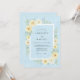 This design features a soft cornflower blue backdrop adorned with a delicate watercolor arrangement of buttery yellow roses and creamy white dahlias. Lush sage greenery and ethereal botanical sprigs create a serene atmosphere perfect for a romantic spring or summer event. The palette blends cool pastel tones with warm floral accents to evoke a sense of timeless elegance and natural beauty.