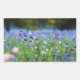 A field of cornflowers in shades of deep and pale blue, purple, lavender, and pink, with pale green leaves.