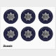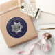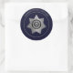 Correctional Officer Badge ROUND STICKERS-is a graphic art design. The badge is created in silver (or gold) and black with a small touch of blue. A decorative seven (7) point silver or gold star forms the badge. Text curving the top of the badge reads: DEPARTMENT OF CORRECTIONS. Text curving the bottom reads: CORRECTIONAL OFFICER. These words sit on a solid blue ring. More silver/gold decorates the badge throughout. An eagle emblem with silver/gold stars sits in the centre. Smaller text in the centre reads: Seal of the State. The badge is NOT state specific. A blue outer rim with silver/gold text curving around the top that reads: CORRECTIONAL OFFICER. This badge design comes in silver or gold with black or blue backgrounds. This background is solid blue with a silver badge, decorative silver text and silver rims.