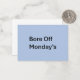 Ajoutez une touche gaie à vos notes avec notre carte de billet plat sarcastique "Bore Off Monday's" ! Idéal pour envoyer un message humoristique ou simplement égayer la journée de quelqu'un, cette carte se fond avec le style, ce qui en fait un choix parfait pour ceux qui apprécient une touche de sarcasme.