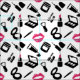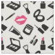 Fabric with a makeup pattern in pink, black, and white featuring cosmetics products like lipstick, mascara, eyeshadow, and more.