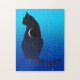 Puzzle in a silhouette of an elegant sitting cat patterned with a starry sky and crescent moon on an evening blue, starry background