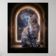 A graceful cosmic cat sits quietly by a glowing window into the universe, its sleek body formed from soft nebula textures and shimmering starlight. Its luminous eyes gaze outward, creating a sense of curiosity and calm. The cozy interior blends seamlessly with the infinite cosmos beyond, resulting in a warm yet mysterious atmosphere. This artwork is perfect for cat lovers, modern interiors, and decorative spaces that embrace both comfort and celestial beauty.
