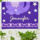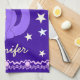 A smiling purple kitty cat with green eyes, lots of lucky stars, midnight blue kitchen towels with pink trim, pale yellow lettering. You can personalize these tea towels by replacing the current text in the text box (ie Jennifer) with your name or desired text. Use the customize feature to change font size, colour or style if desired. Have a happy day!