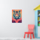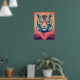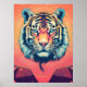 A striking artwork of a tiger's face glowing with vibrant colours and cosmic energy. Set against an ethereal gradient of orange and pink hues, the tiger's piercing blue eyes radiate power and wisdom. Circular patterns and swirling galactic motifs in the background amplify its mystical aura, symbolizing strength, balance, and the universe's untamed beauty.
