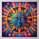 Embrace the cosmic energy with this vibrant and psychedelic digital artwork. This mesmerizing piece features a radiant sun surrounded by a kaleidoscope of swirling patterns, celestial symbols, and celestial bodies. The intricate details and vibrant colours create a captivating visual experience.