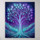 This fantasy poster features a vibrant purple tree with glowing teal leaves, swirling cosmic colors, and mystical floral accents in a dreamy surreal fantasy scene. Finished in a oil acrylic painterly style.