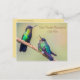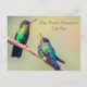 Postcard featuring two green, orange and yellow fiery-throated hummingbirds perched together, one with its beak open as if talking to the other, in Costa Rica. Photo taken at Paraiso Quetzal Lodge, San Gerardo de Dota, Costa Rica.