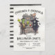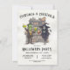 Fun Costumes and Cocktails Halloween party invitations. Features Frankenstein and a Wicked Witch with orange and green cocktails in front of a bar filled with alcohol pumpkins. Watercolor illustration. Great for a fun adult Halloween party!