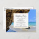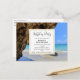 Invitation carte postale anniversaire avec une photo nature pittoresque. Belle mer bleu turquoise avec une plage de sable fin. Une grande roche brune offre de l'ombre du ciel bleu vif.