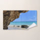 Serviette à main avec une photo nature pittoresque. Belle mer bleu turquoise avec une plage de sable fin. Une grande roche brune offre de l'ombre du ciel bleu vif.