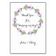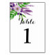 A wedding table number card showcasing a watercolor floral spray in purple and green for the reception tables. A wonderful addition to a cottage garden themed ceremony. On the reverse side is wreath of leaves in purple and green with the text - Thank You for Sharing Our Day!