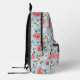 This beautiful backpack features a pattern of garden flowers in shades of pink, blue, cream and green. Personalize the matching pink stripe with your choice of name or special text.
