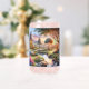 This enchanting artwork captures a dreamy cottage garden bathed in the golden glow of sunset, where colorful blooms and tall foxgloves line a gentle stream that winds past cozy houses and old wooden bridges. A large tree anchors the scene, its sprawling branches casting dappled shadows over the vibrant flowerbeds bursting with lupines, peonies, and wildflowers. Warm lights twinkle along the path, creating a soft, magical ambiance that feels both nostalgic and serene. The pastel tones, painterly brushstrokes, and whimsical composition give the piece a timeless, cottagecore charm—perfect for evoking the peace and poetry of slow-living landscapes. AI generated artwork.