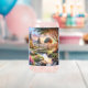 This enchanting artwork captures a dreamy cottage garden bathed in the golden glow of sunset, where colorful blooms and tall foxgloves line a gentle stream that winds past cozy houses and old wooden bridges. A large tree anchors the scene, its sprawling branches casting dappled shadows over the vibrant flowerbeds bursting with lupines, peonies, and wildflowers. Warm lights twinkle along the path, creating a soft, magical ambiance that feels both nostalgic and serene. The pastel tones, painterly brushstrokes, and whimsical composition give the piece a timeless, cottagecore charm—perfect for evoking the peace and poetry of slow-living landscapes. AI generated artwork.