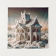 A beautifully crafted house made entirely of soft cotton, featuring sophisticated architectural details like arches, columns, and a gabled roof. The cozy, dreamlike material contrasts with the precise design, creating a unique blend of softness and elegance. Set in a serene landscape, this cotton house feels both surreal and inviting, with cotton clouds floating overhead, completing the tranquil atmosphere.
