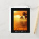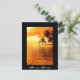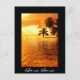 Carte postale avec palmier horizontal accroché au-dessus de l'eau de l'océan pacifique au coucher du soleil sur une île tropicale avec une bordure noire et le texte : 'Bora Bora'.