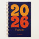 2024 apparaît dans une grande police. Le planificateur est en dessous de l'année. Le texte affiché pour le nom se trouve en bas. Les chiffres et le texte sont dans les tons orange. Le planificateur en bleu foncé.