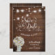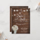 Country Save the Date - Rustic barn wood with glowing string lights at the top and a mason jar with baby's breath and custom handpainted chamomile flowers (or white daisies) . Ornate Calligraphy venue title - Design by BarefootBride™
