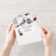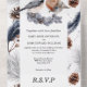 A beautiful all-in-one woodland watercolor invitation featuring a beaitiful tit and Robin bird standing on a silver pine branch that has a single brown pine cone on it. They are framed by a pretty blue grey, brown and pale grey background that is filled with pine cones, berries and leaf foliage branches. The bottom third has a tear off response card with personalized rsvp address for your guests to complete. These are ideal for winter country or fall celebrations and woodland forest theme parties.