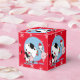 Black and white spotted cows wearing Santa hats on a red box with snowflakes. Use for gifts of party favours.