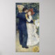 Country Dance by Pierre-Auguste Renoir, oil on canvas 1883, is a painting of a French couple dancing closely and exuberantly on a dance floor. The man wears a dark blue, formal suit, while the woman smiles brightly in a long white patterned dressed daintily clasping a fan in her raised hand. Renoir captures the warmth, human empathy, and painterly realism of a fleeting moment in time in rapidly applied brush strokes in a tall, vertical composition.
