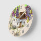 A watercolor graphic of a pretty farmhouse with an A-frame pitched brown roof, a wooden barn door and small pretty windows is surrounded by trees and grapes hanging from vines. Two adorable white Billy goats appear in the foreground and the graphics are framed by pale grey numbers. This is ideal for a country farm house; as a birthday present for anyone who loves goats or for a farm that produces goats cheese; wine and by-products.