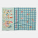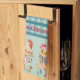 Country kitchen towel features two colourful folk art roosters at the bottom with flowers all around their feet. The top portion of the towel is two shades of blue in a gingham check pattern.  Personalize it with your name in the panel or delete it if you don't want it personalized. Choice is yours.