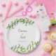 A chic country garden wedding paper plate featuring natural fresh eucalyptus leaves green foliage, framing your names set in elegant script and special wedding date set in classic typography. Designed by Thisisnotme©