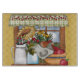 Perfect for a country kitchen, this cutting board features window scene with rooster, sunflowers and apples with gold background.