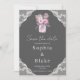 The invitation boasts a refined grey background that exudes understated elegance. Accentuating each corner are intricate white lace borders, adding a touch of vintage allure and enhancing the invitation's romantic appeal. The harmonious contrast between the soft grey hue and the delicate lace creates a captivating and sophisticated aesthetic that will capture the hearts of your guests.