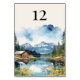 Wedding table number card with watercolor design featuring a charming rustic wedding barn nestled on the shores of a tranquil lake, framed by majestic mountains and towering pine trees. The watercolor country scene captures the serene beauty of a sunlit day, with the barn's warm wooden hues perfectly reflected in the still waters. Ideal for a rustic barn wedding, this design complements celebrations in cabin-themed settings or charming countryside venues. Its tranquil lakeside ambiance suits a lakefront wedding reception, combining the romance of a romantic mountain wedding with the relaxed charm of a woodsy outdoor wedding. Whether you’re planning a spring lakeside wedding or a fall mountain wedding, this design sets the perfect tone for a day steeped in rustic elegance and natural beauty. Browse my Country Lake Wedding collection for co-ordinating invitations, stationery, signs and wedding décor. Message me if you need me to add any additional templates.