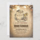 Rustic country baby shower invitation in a rural western style design with cowboy boots, barrel, sunflowers and barn wedding string lights.