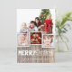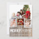 Rustic, weathered wood background and whimsical mix of typography sets the stage for an playful country holiday greeting for family and friends. With room for a multi photo collage of your family, this design frames three smaller photos and one large photo with a border of simulated wood grain at the bottom and a small smattering of white snowflakes on the edges. Add a pretty ribbon through the hole at the top of the tag shape for a really special look!