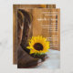 He proposed and you accepted and said YES - now it's time to celebrate you are engaged to be married and gettin' hitched! Invite guests to a celebration honoring the bride and groom to be with the charming Country Sunflower Engagement Party Invitation. This casual yet classy custom rustic ranch theme engagement Barn party invite features a quaint floral photograph of brown leather cowboy boots, yellow sunflower blossom and brown barn wood on white satin.