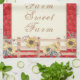 Farmhouse / country themed kitchen towels with watercolor sunflowers on rustic fence and red bandana background. Customizable "Farm Sweet Farm" text can be personalized.