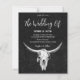 Invite your guests to your special day with these black and white country western farmhouse rodeo bull skull vertical budget wedding invitations. Beautiful rustic texture background to customize your information on. Image copyright Marg Seregelyi Photography.