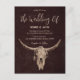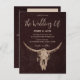 Invite your guests to your special day with these country western ranch style, brown farmhouse rodeo bull skull vertical wedding invitation postcard. Modern vintage rustic texture background to customize your information on. Image copyright Marg Seregelyi Photography.