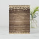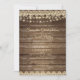 A rustic, country wedding invitation with a weathered wood plank background, cream/beige lace and soft glowing string lights complements outdoor, country, western, barn and/or relaxed weddings. All text is editable (delete any sample text to leave blank) and the font style, size, colour and placement can be changed to accommodate your needs by clicking on the "click to customize further" tab. The back of the invitation features the same wood plank background and offers a place to add additional information.