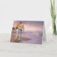 Couple in Love Walking on Beach into the Sunset. One in a series of at least seven designs of a couple in love on the beach with the waves lapping the shore, and a beautiful sunset in the cloudy sky. The image of the plain beach scene, without the couple, available on a postage stamp to match these cards.