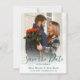 Couple photo Save the Date wedding announcement card with website information, emerald green font.