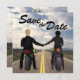 This unique Save the Date invitation features beautiful road and fields scenery with a boy and girl couple on motorcycles holding hands. The boy is blonde and the girl is a brunette. Other hair colour options are available upon request! Perfect for a biker couple! Easily customize this Save the Date with all of the details for your wedding.