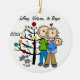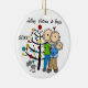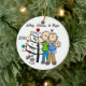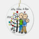 A pretty round ceramic keepsake Christmas holiday ornament features a stick figure couple with a baby boy in a blue blanket and a cat standing in front of the decorated Christmas tree with areas you can easily customize with names and date to the current year! This beautiful holiday keepsake ornament makes a great gift for anyone who had a new baby boy in the current year!